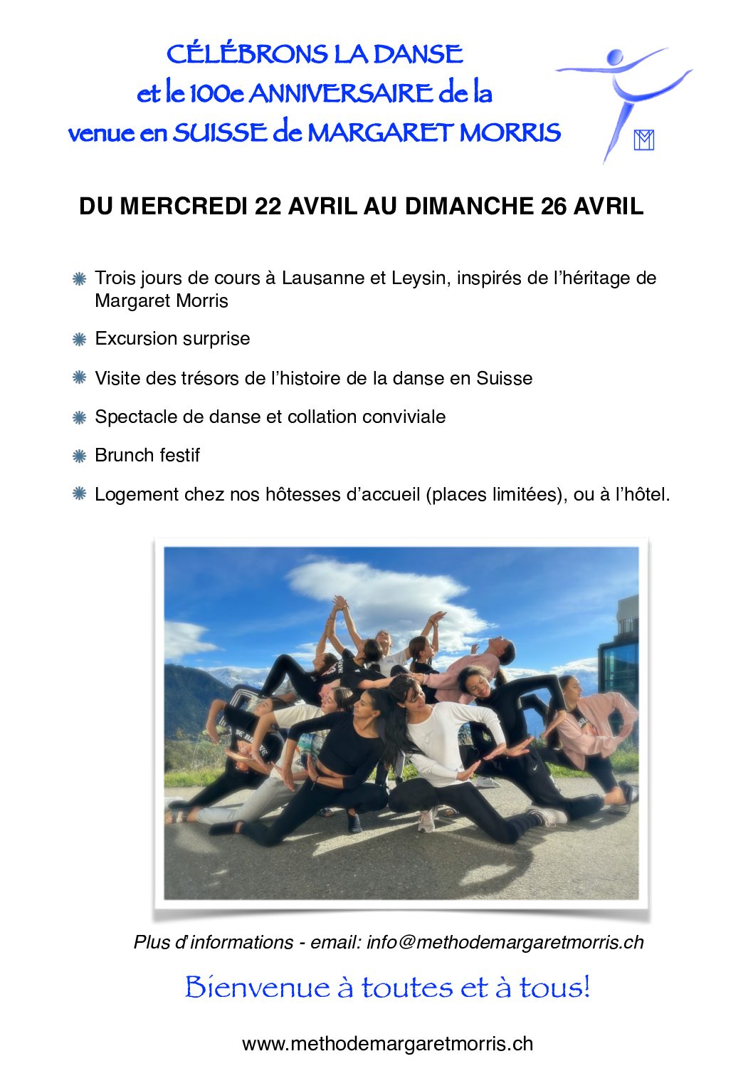 Que vous soyez débutantes ou avancées, venez passer quelques jours de vacances actives à Leysin. Ce stage comportera des cours Margaret Morris pour débutants et avancés, des portes ouvertes, démonstrations, animations, soirées chorégraphiques et visite culturelle. Comme les autres fois, les conjoints sont les bienvenus ! Informations, programme et formulaire… Lire plus …